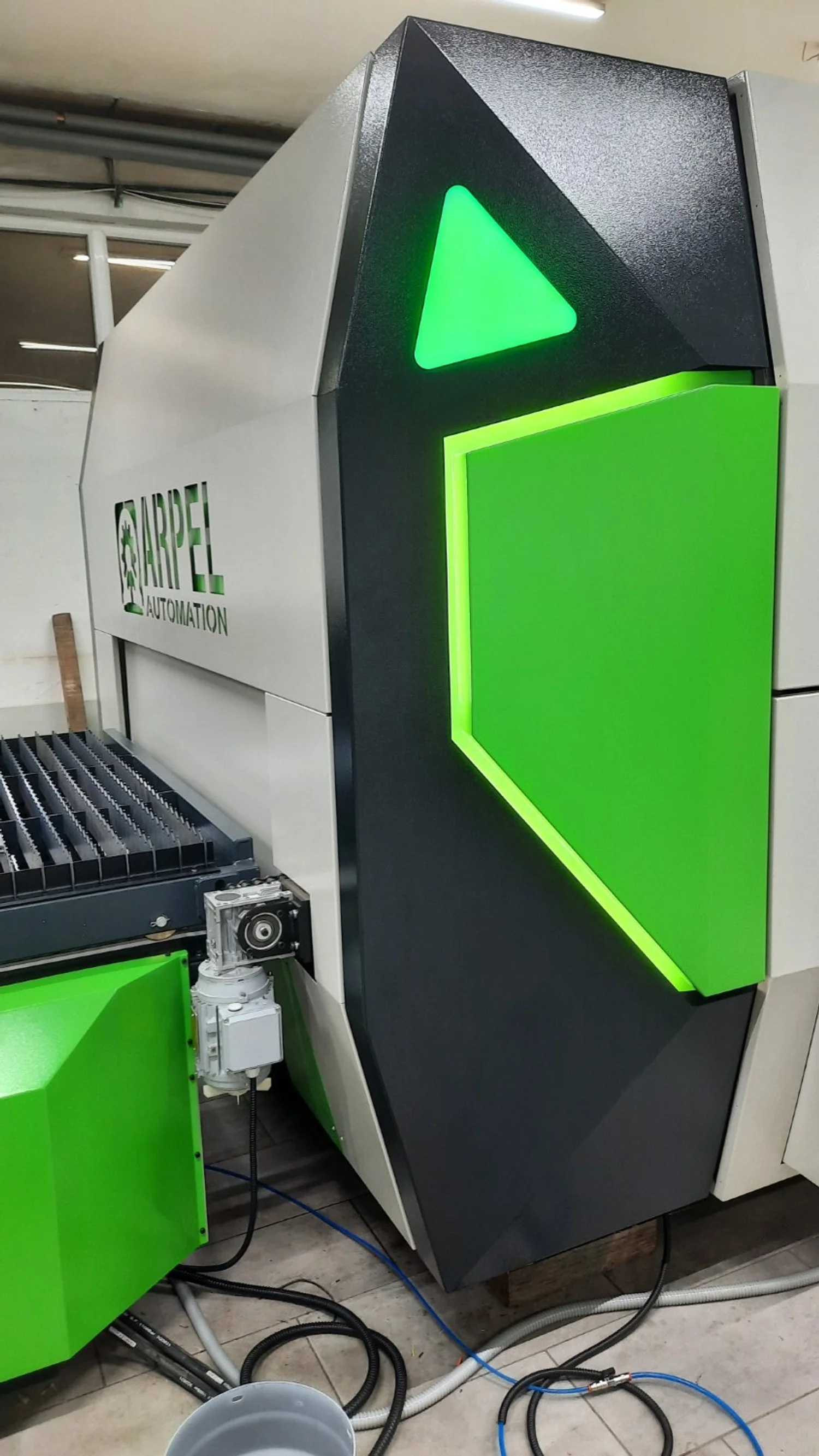 This machine is a compact cantilever design that allows a shelf to be pulled out and in to load and unload the parts.